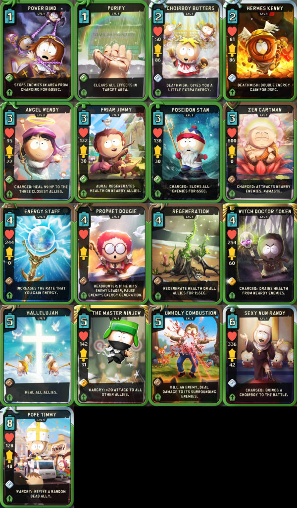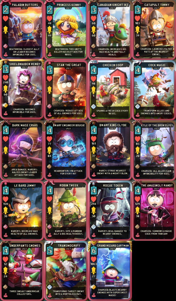 South Park: Phone Destroyer has finally been released worldwide and it is off to an exciting start! Check out the image below to see all South Park: Phone Destroyer cards. Underneath the image, we have put together a chart to make the descriptions much more readable and concise.
